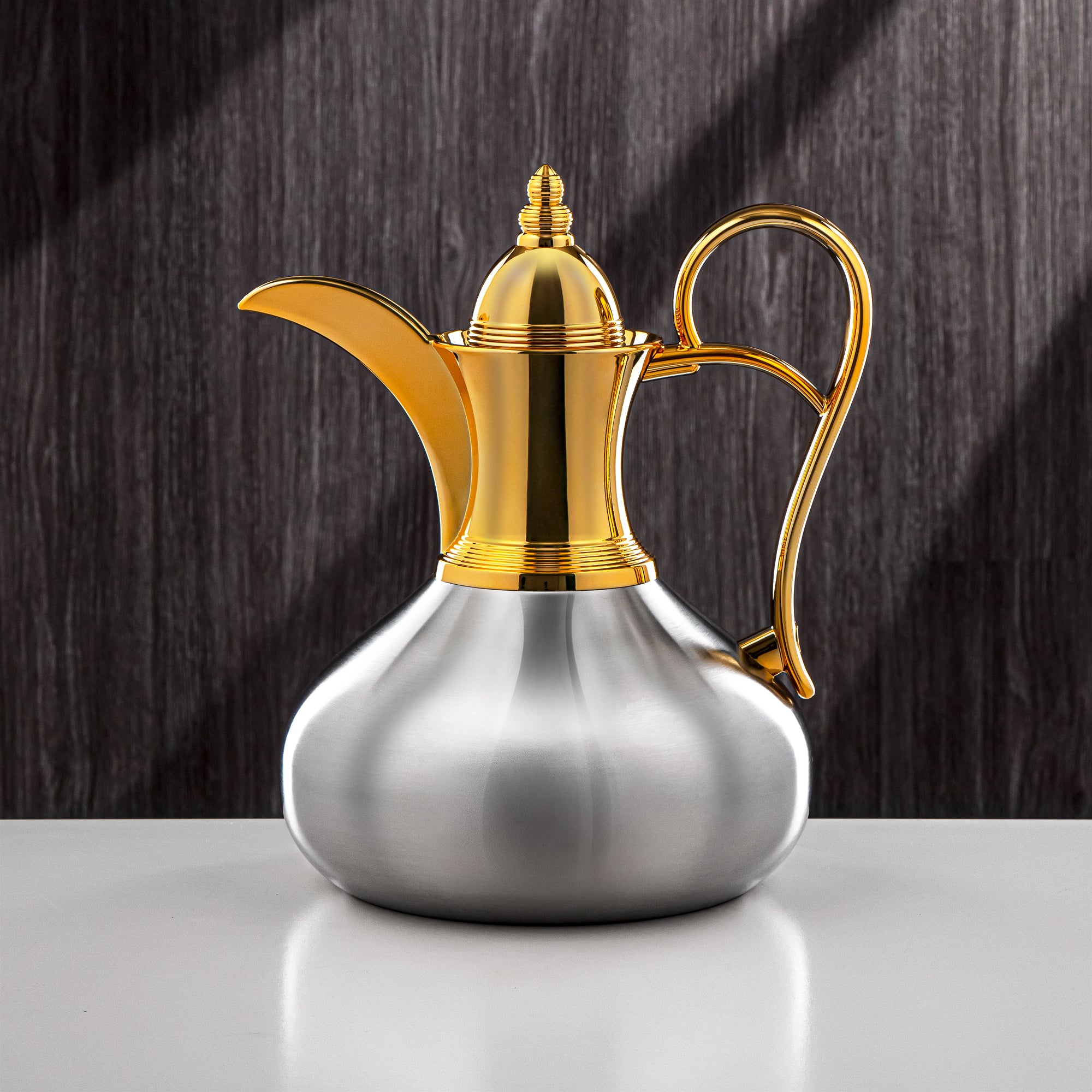 Indulge in luxury and style with Almarjan's 1L Stainless Steel Vacuum Flask in Gold & Matt Silver. Featuring a push button and double wall insulation, this flask keeps your rich Arabic coffee hot and ready to share with family and friends during special occasions like Ramadan and Eid. It is also a perfect gift for those who appreciate the finer things in life.