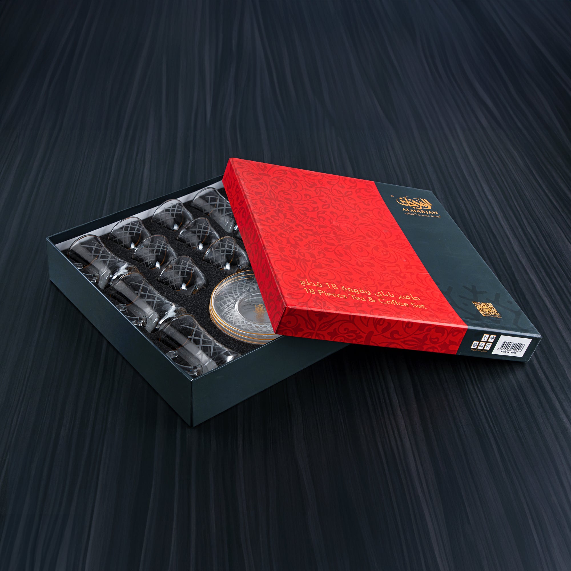 Almarjan 18 Pieces Diamond Collection Glass Tea & Coffee Set With Golden Rim - GLS2630018