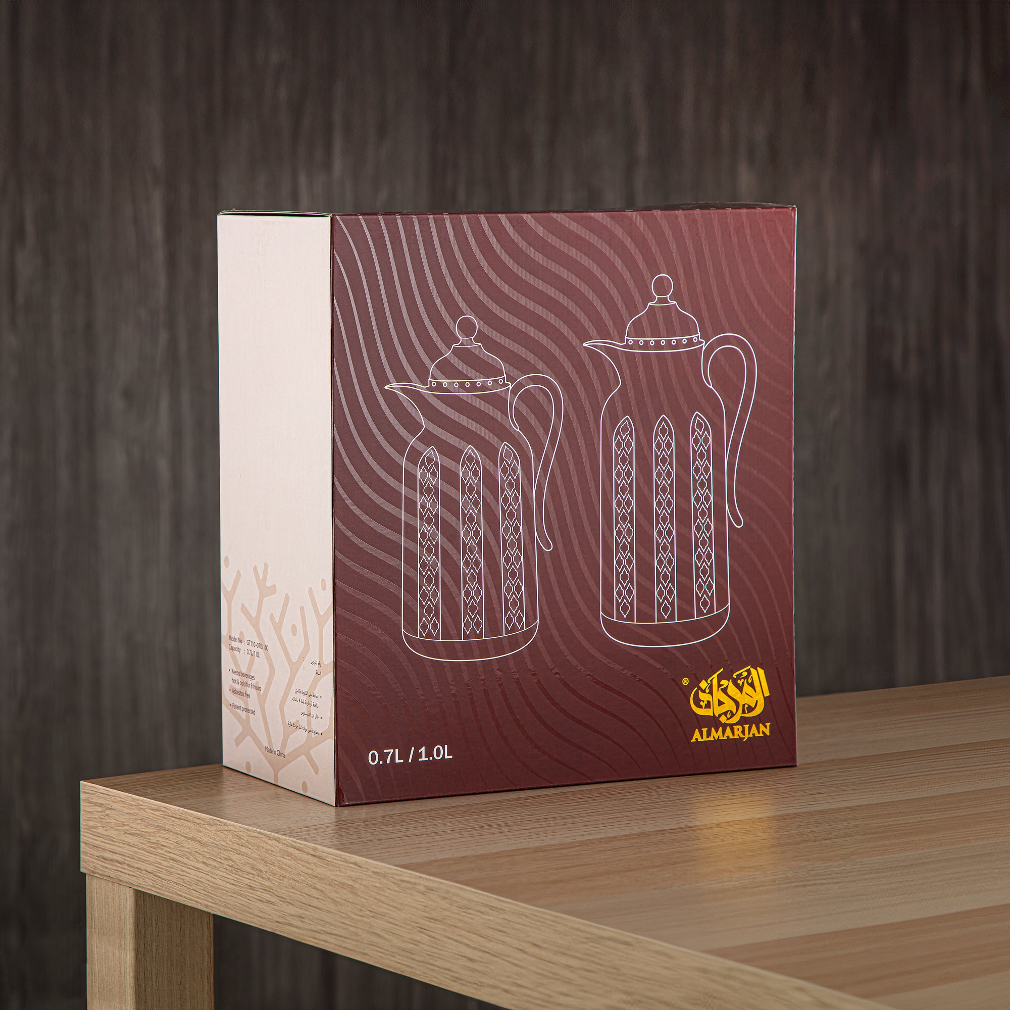 Elevate your tea and coffee experience with the Almarjan 2 Pieces Vacuum Flask Set. This set includes 0.7 and 1-liter flasks, perfect for daily use or special occasions. The push-button design and matt finish add functionality and sophistication to your beverage service.
