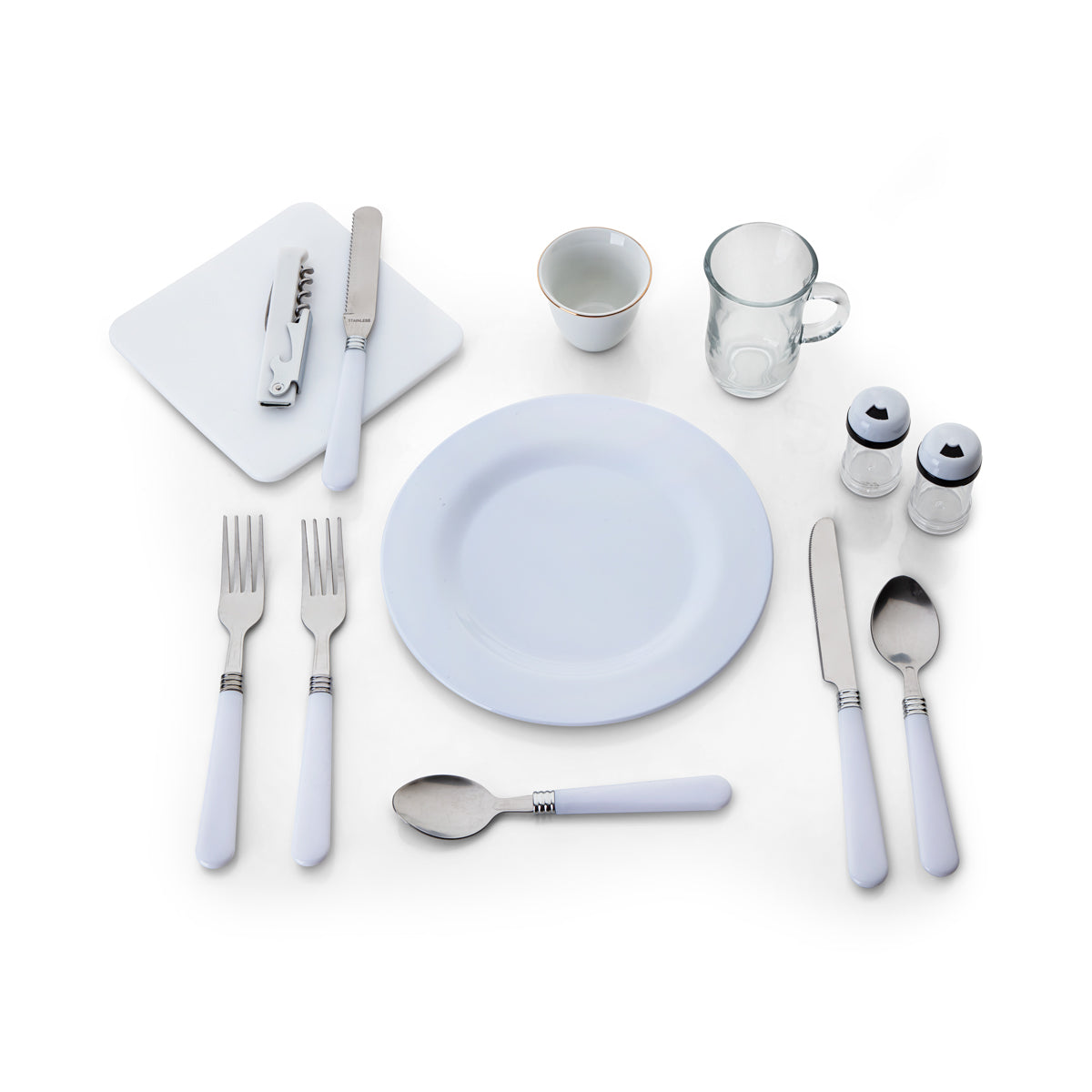 • Set Consists of: 6 Deser Spoons, 6 Dessert forks, 6 Knives, 6 Tea Cups, 6 Cawa Cups, 6 Plates, 6 Napkins, 1 Spreader, 1 Bottle Openner, 1+1 Salt & Pepper Shakers