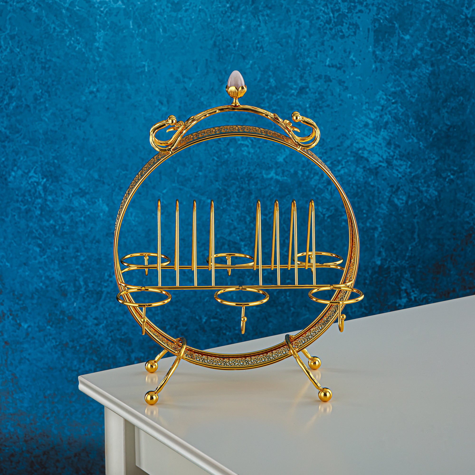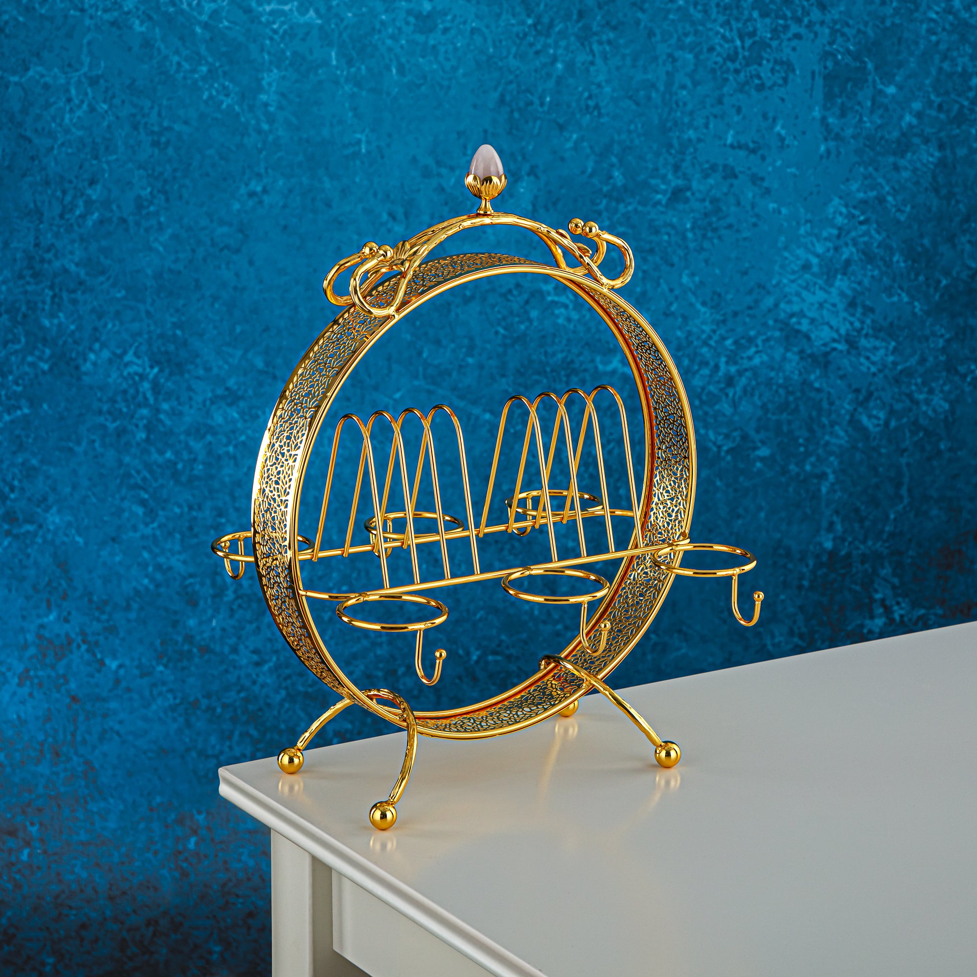 قم بخدمة ضيوفك بأناقة مع حامل أكواب الشاي والقهوة الذهبي من المرجان. إنها مصنوعة من المعدن المطلي وهي قادرة على استيعاب 6 أكواب شاي و6 أكواب قهوة للحصول على خدمة فاخرة. هذه القطعة ذات الطراز الكلاسيكي هي الخيار الأمثل لإظهار ذوقك الراقي.