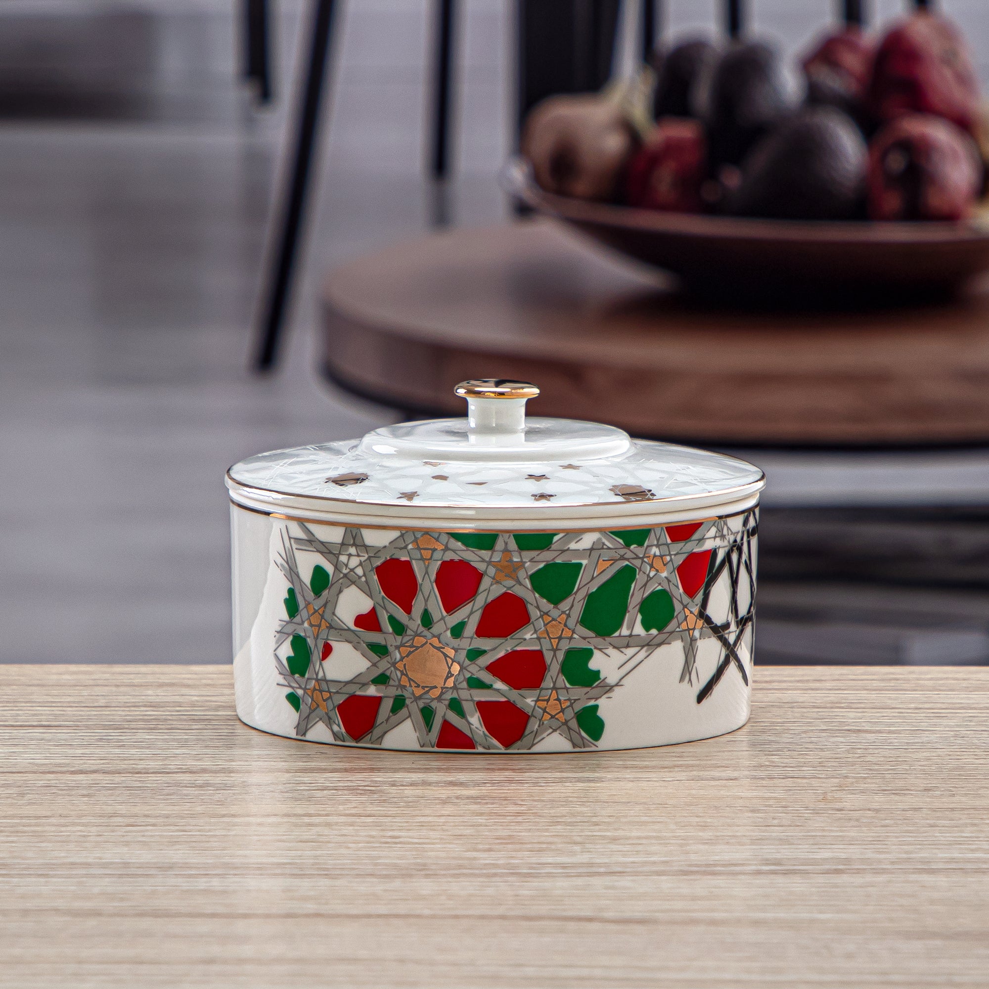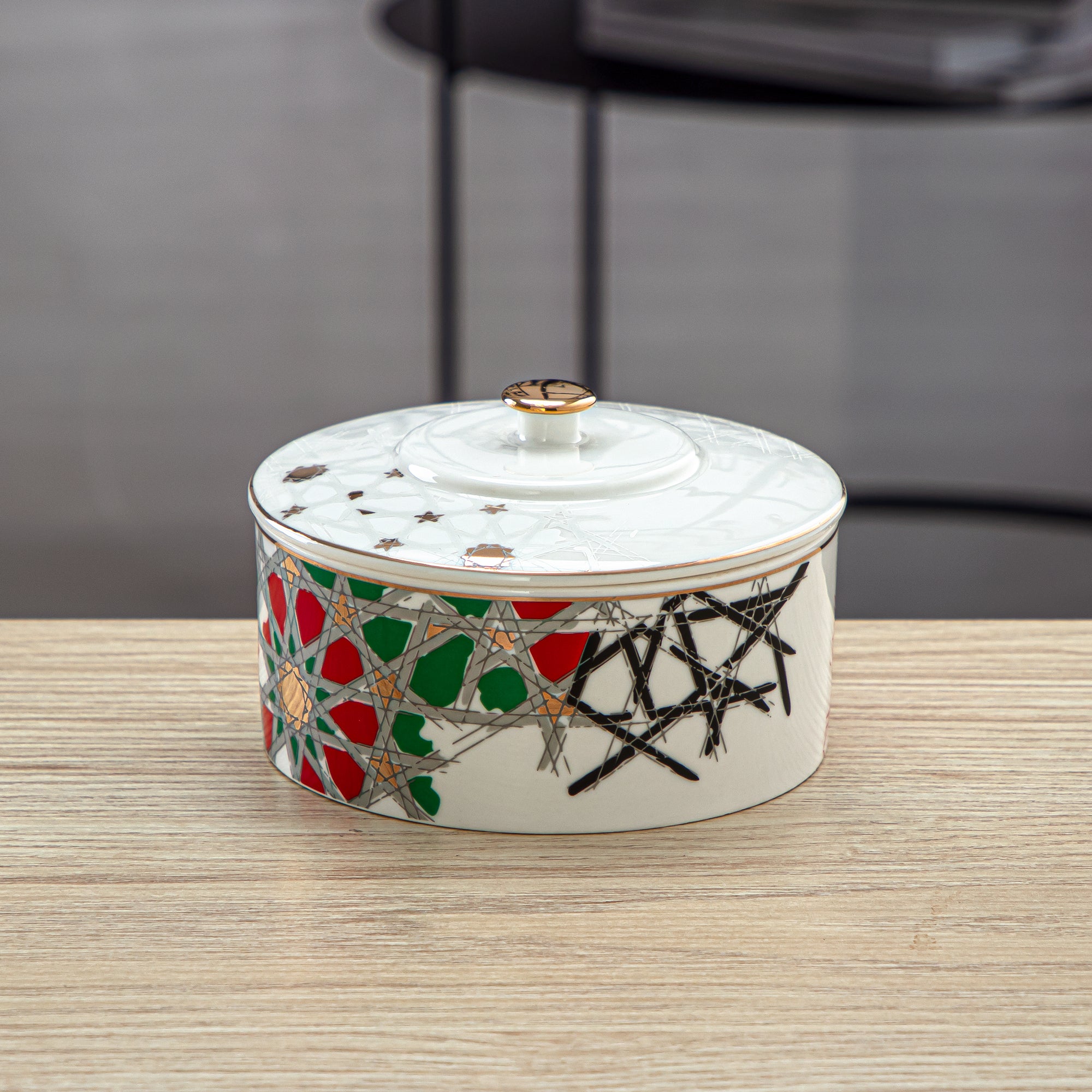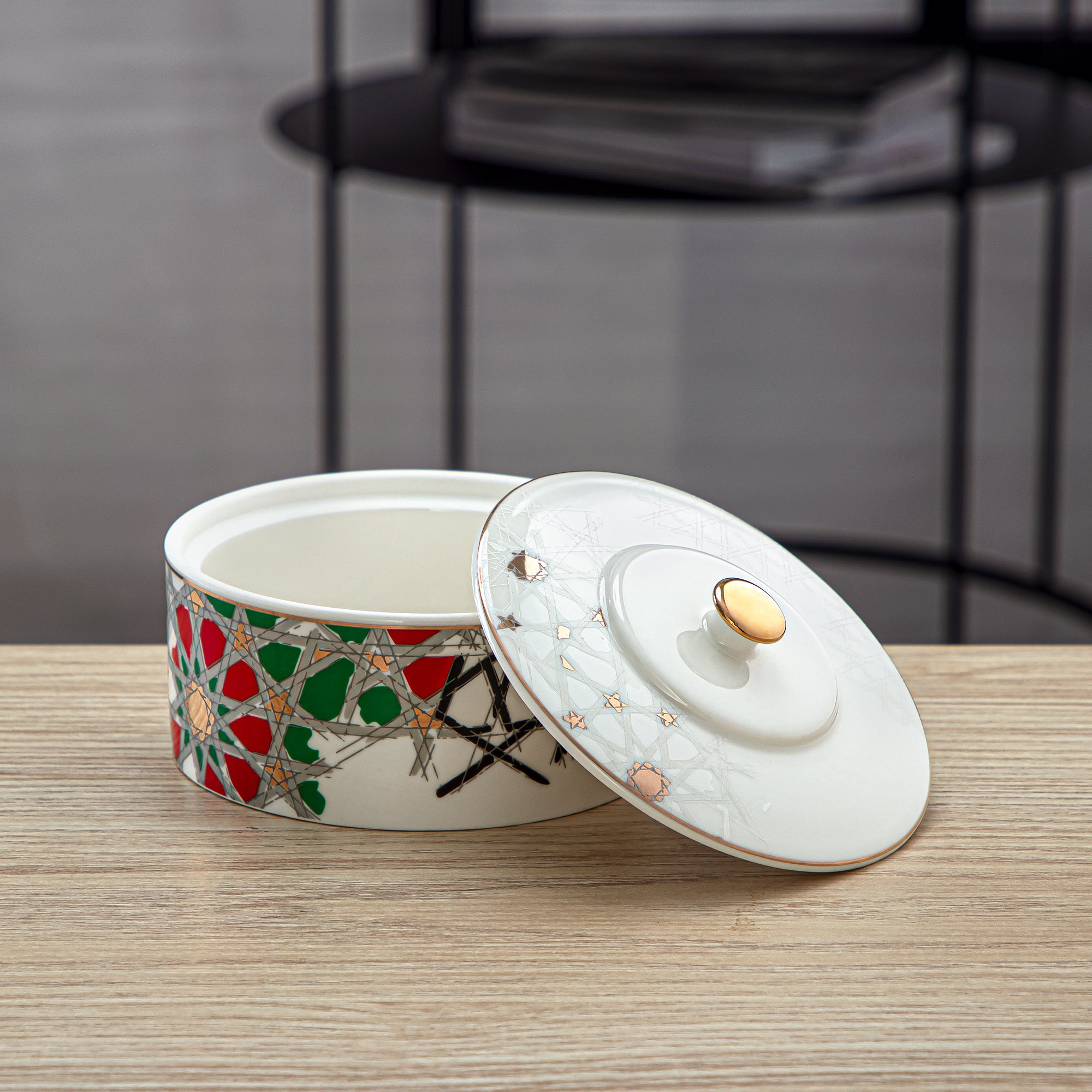 يُعد هذا الوعاء الرائع المصنوع من البورسلين من مجموعة فونون مقاس 11 سم بغطائه الأنيق مثاليًا للاحتفال بالمناسبات الخاصة. تم تصميمها بشكل معقد مع زخارف اليوم الوطني، وهي تقدم عرضًا لذيذًا للحلوى والحلويات الأخرى، مما يجعلها هدية مثالية.