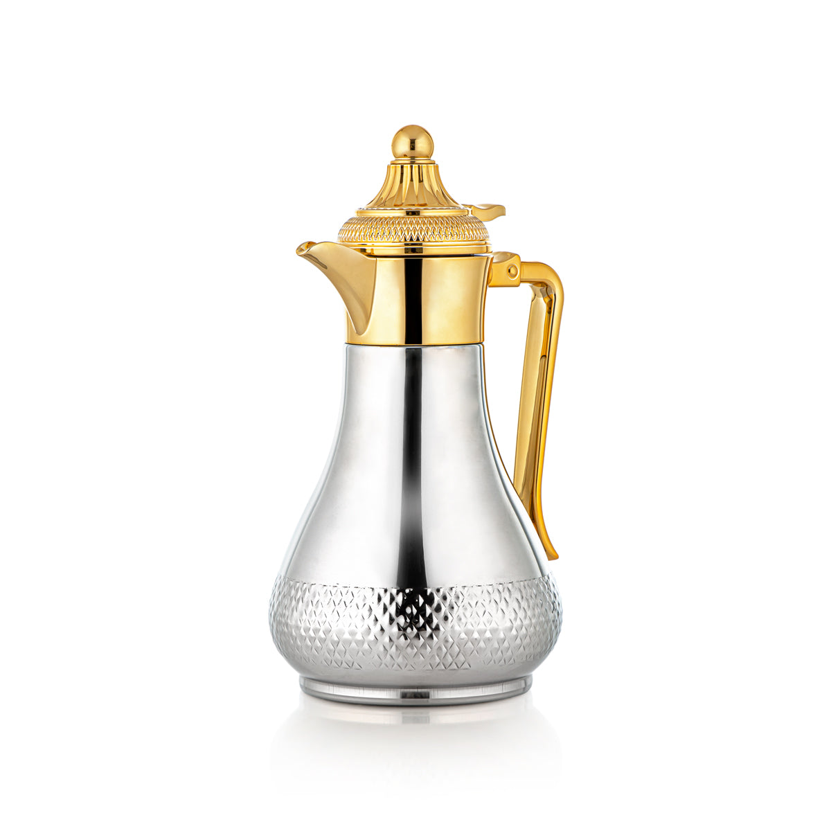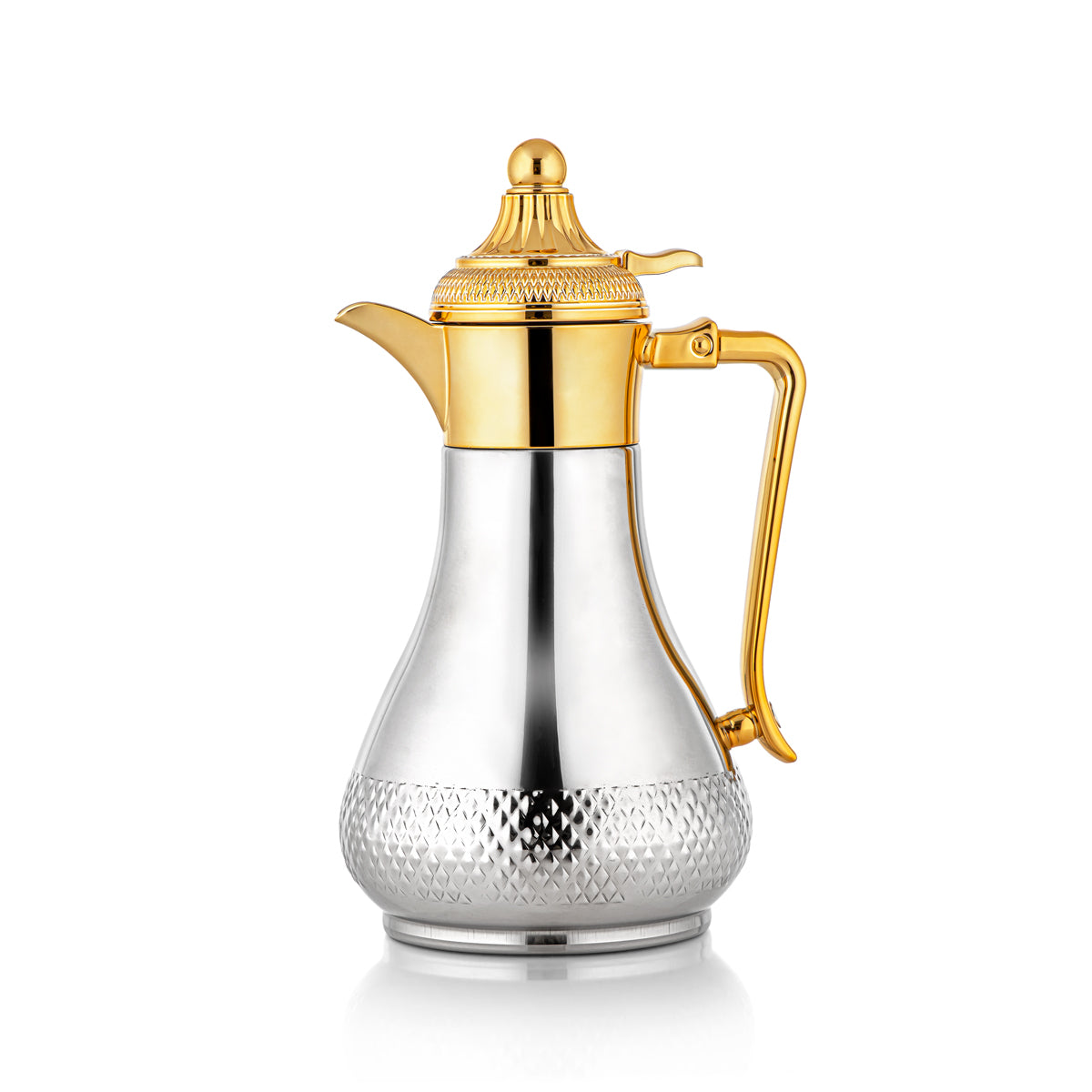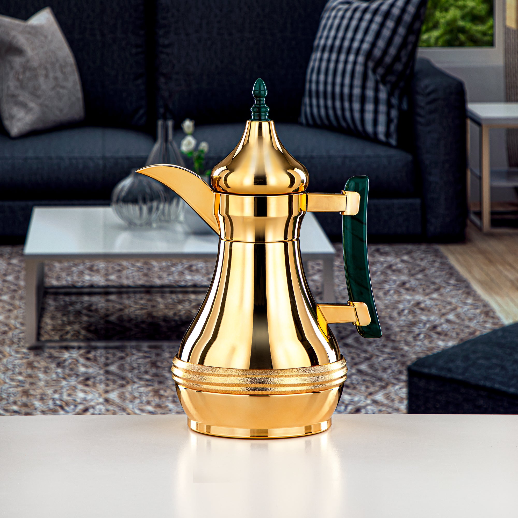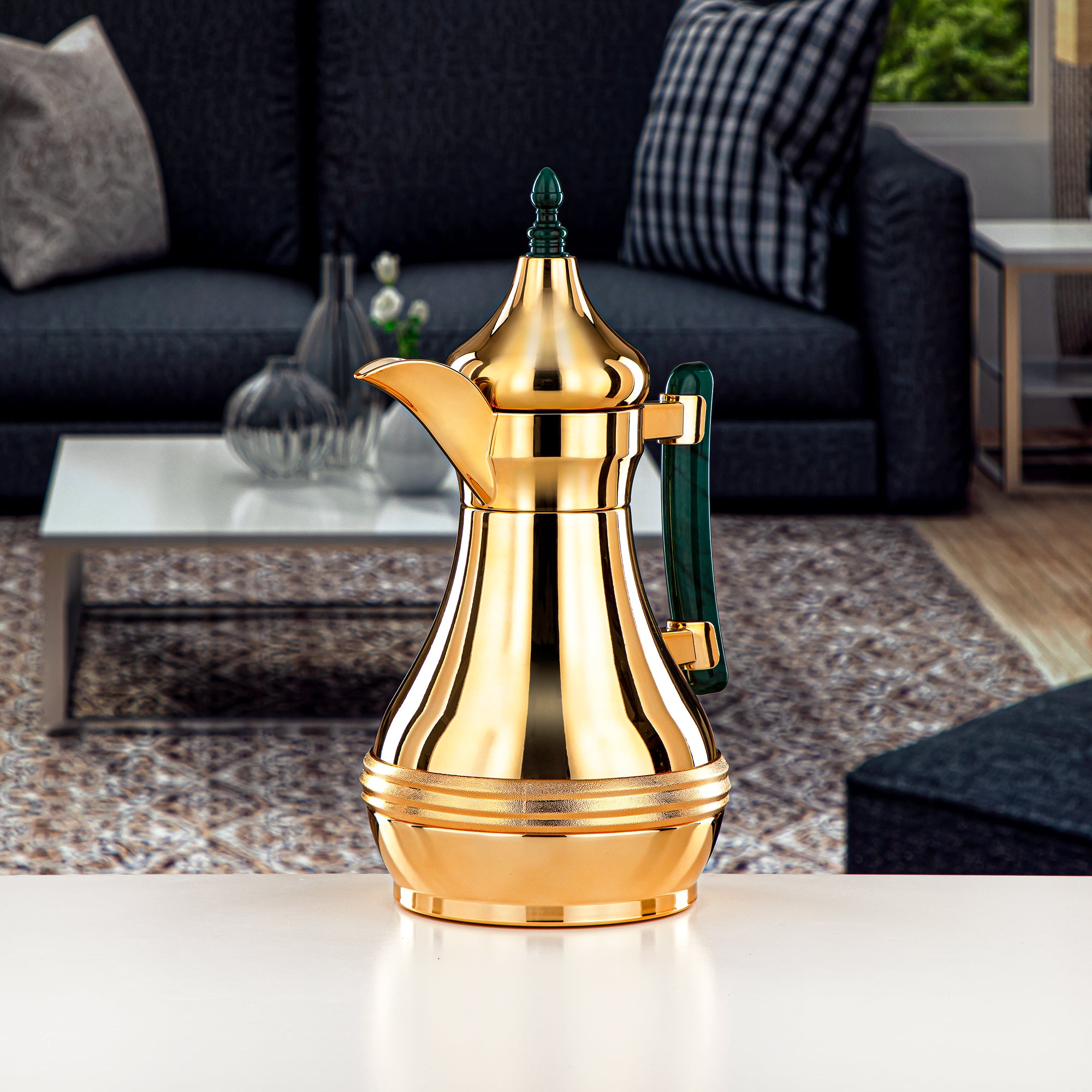 انغمس في فخامة ترمس المرجان المصنوع من الستانلس ستيل سعة 1 لتر. مع هيكل مزدوج من الستانلس سايل وتصميم ذهبي أنيق، فإن هذه الدلة ممتعة من الناحية الجمالية والعملية. يضفي المقبض والمقبض الرخامي الأخضر المذهل لمسة من الأناقة، في حين أن زر الضغط يجعله مثاليًا لتقديم القهوة العربية التقليدية خلال المناسبات الخاصة مثل رمضان والعيد.
