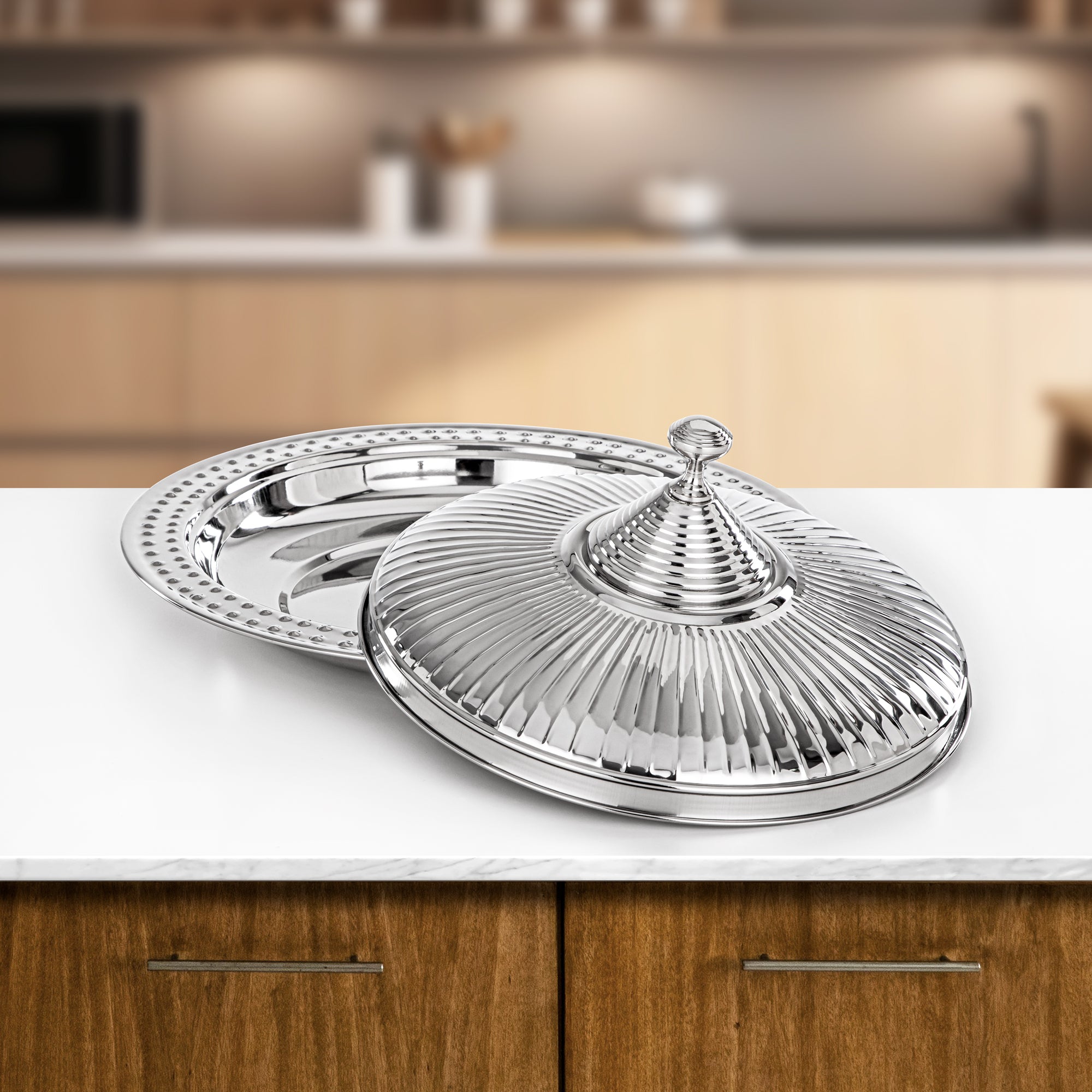 صُنعت هذه الصينية في الهند من الفولاذ المقاوم للصدأ الفاخر، وتتميز بلمسة نهائية مصقولة تضيف الرقي إلى أي مناسبة. يضمن الغطاء المتضمن بقاء الخبز والمعجنات والحلويات الأخرى طازجة ورائعة، مما يوفر الأناقة والعملية لكل تجمع.
