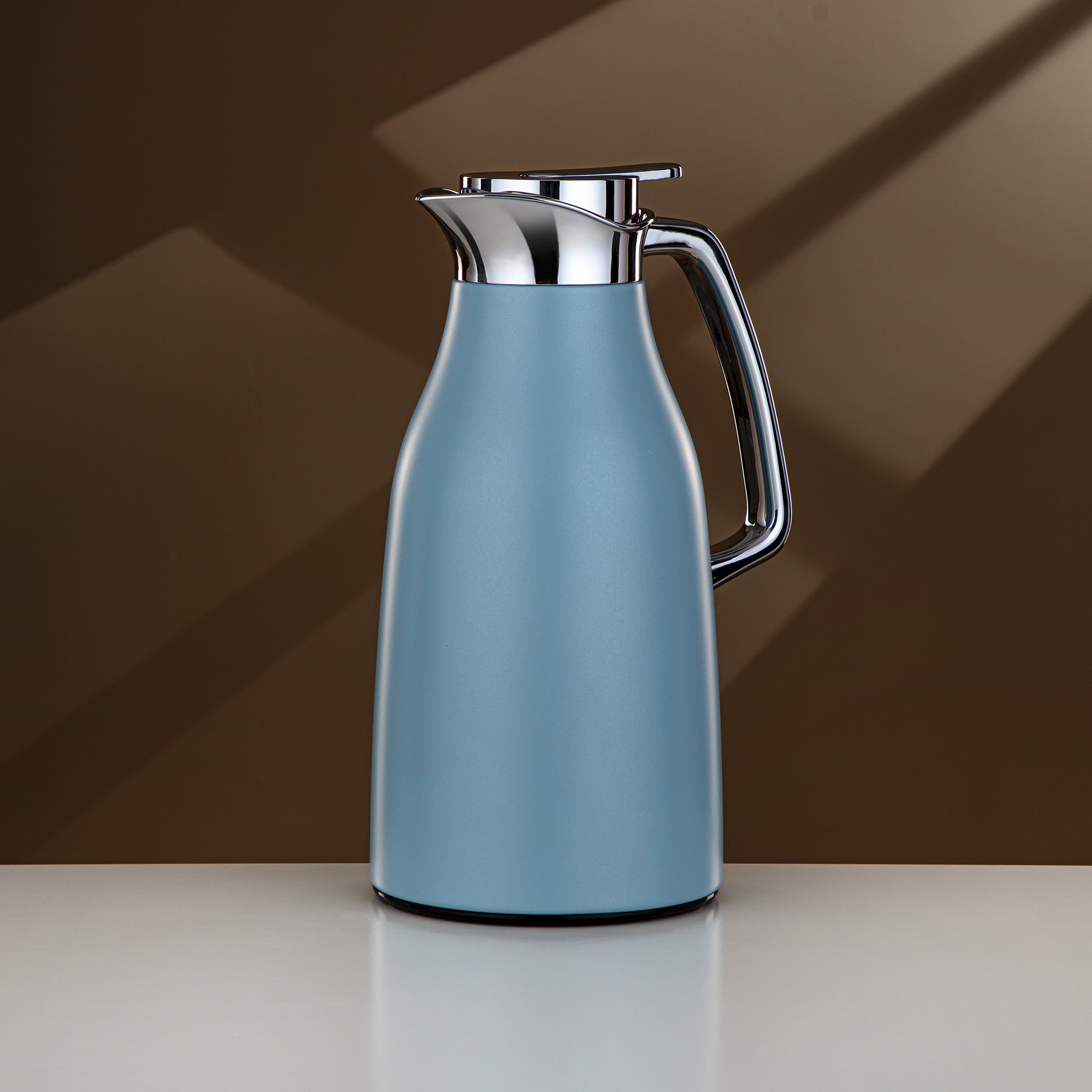 Elevate your beverage experience with Almarjan's 1.3 Liter Vacuum Flask in Matt Blue & Silver. The push button feature allows for easy access while the modern and sleek design adds a touch of sophistication. Perfect for savoring coffee, tea, and more at gatherings or daily use.