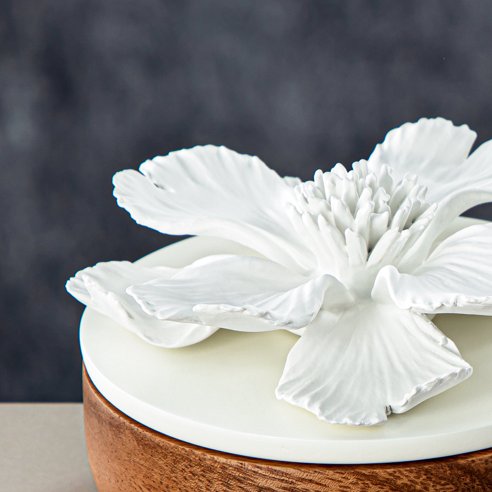 Indulge in luxury with the Almarjan 12 CM Round Cosmos Box. This exquisite wooden bowl is elevated by a ceramic cover, adorned with a charming flower-shaped knob. Admire the beauty of art and nature in one sophisticated piece. Perfect for storing treasured items in style.
