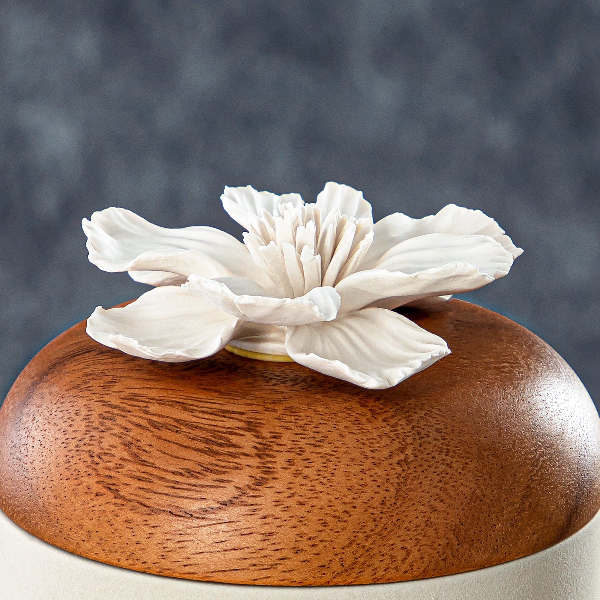 Indulge in luxury with the Almarjan 11 CM Canister. This exquisite ceramic bowl is elevated by a wooden cover, adorned with a charming flower-shaped knob. Admire the beauty of art and nature in one sophisticated piece. Perfect for storing treasured items in style.