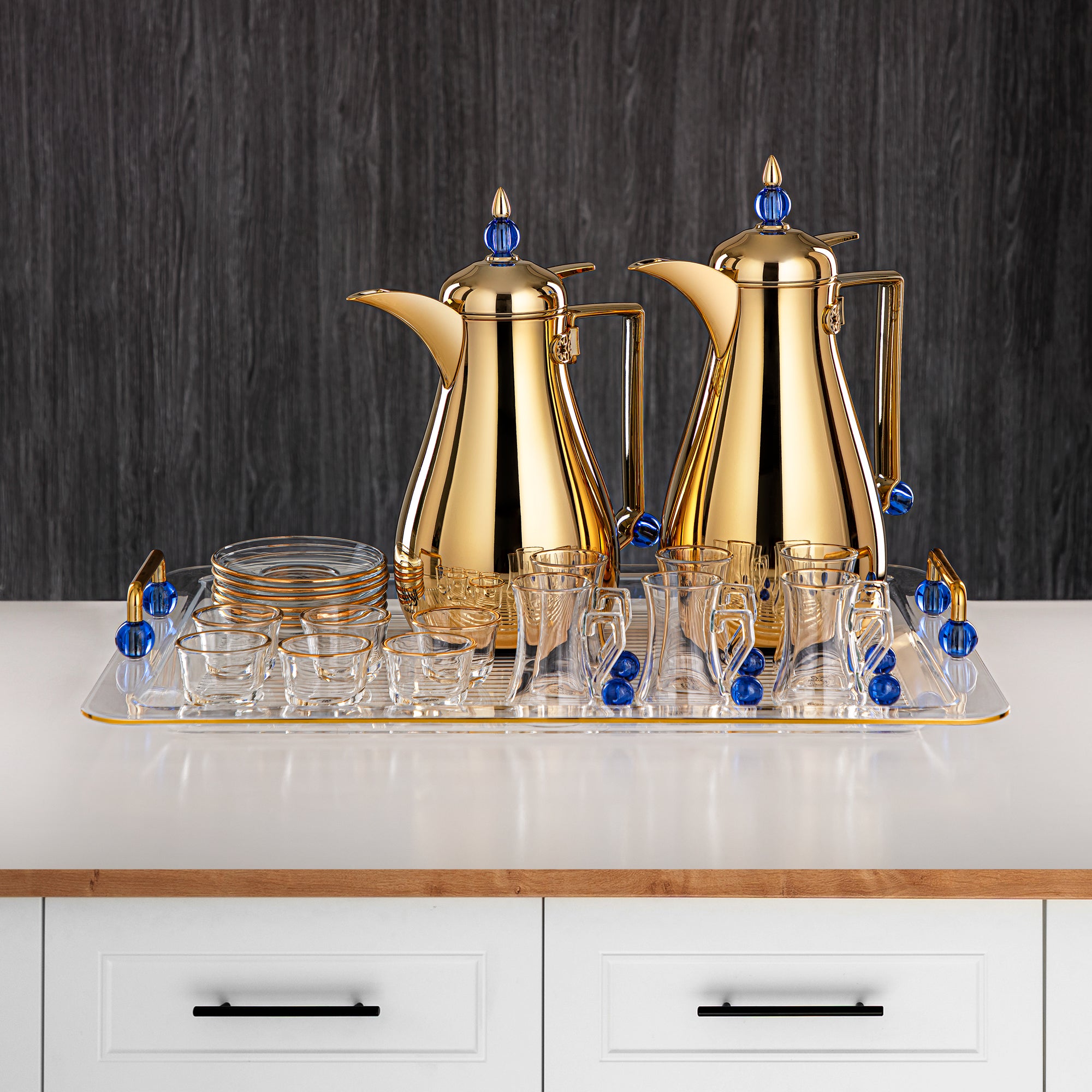 • Set Includes: 2 Vacuum Flasks, 6 Tea Cups, 6 Saucers, 6 Cawa Cups, 1 Tray