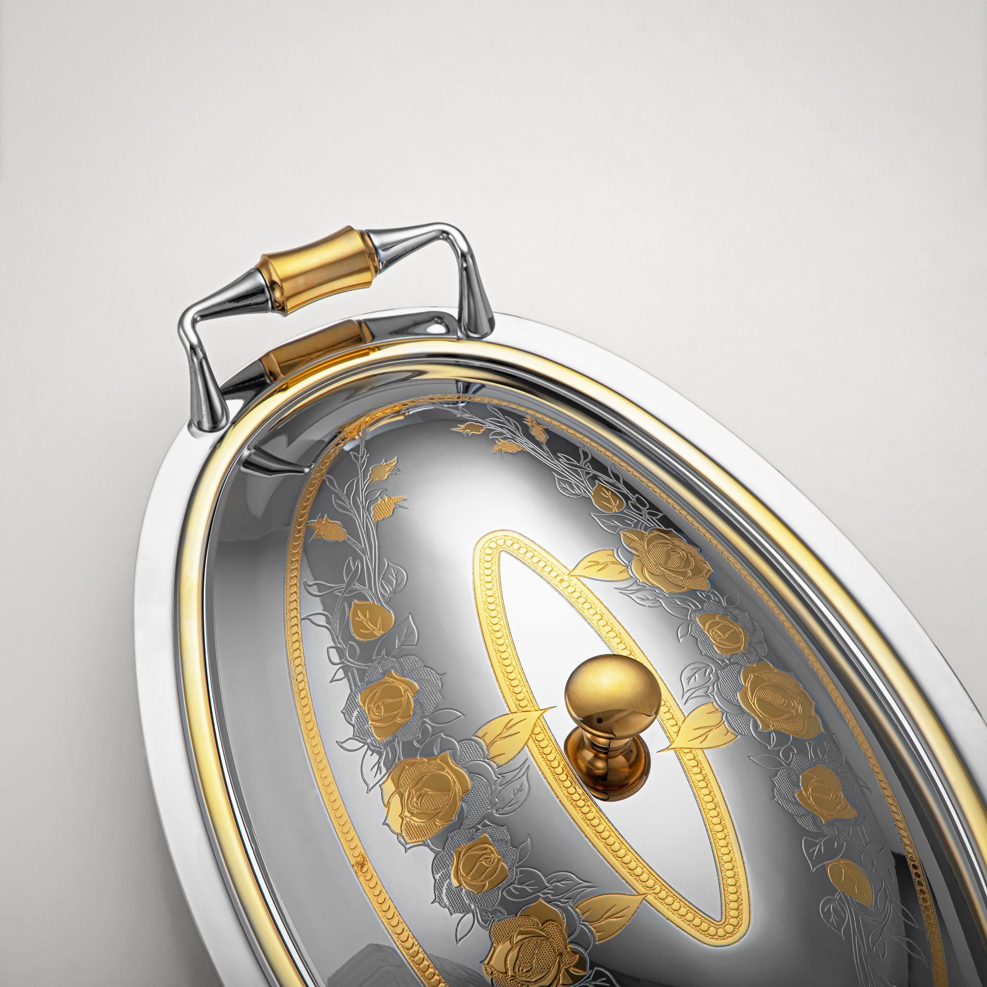 Indulge in luxury and sophistication with the Almarjan 40 CM Lea Collection Oval Serving Tray With Cover. Made in Italy with 18/10 stainless steel, it features an exquisite engraved pattern in stunning silver & gold hues. Perfect for serving different types or cold or hot dishes, it adds a touch of elegance to any gathering or special occasion, including Ramadan & Eid.